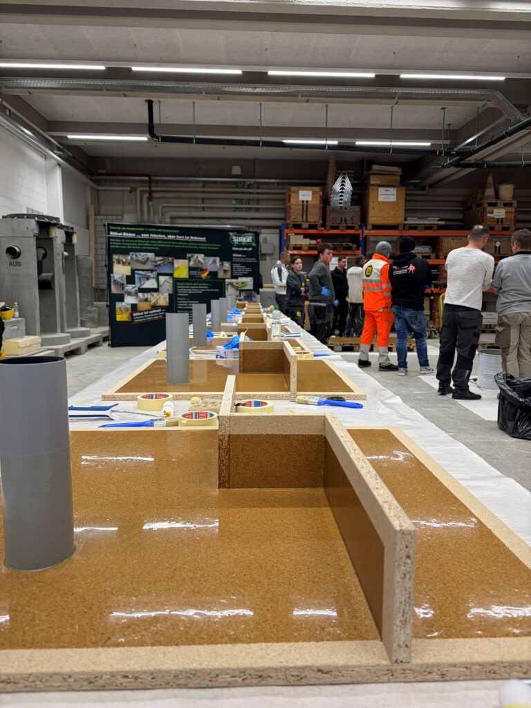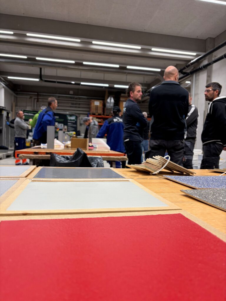 Unser Partner Thomas Bösiger leitete den praktischen Abschnitt und schulte die Teilnehmer in der richtigen Vorbereitung und Anwendung von Silikal-Grundierungen, Abdichtungsmembranen, Bodenbeschichtungen und Versiegelungen. Jeder Teilnehmer konnte die Produkte an einem eigenen Schaustück testen und verarbeiten. Dank unserer breiten Auswahl an Farbchips, -sanden und Pigmenten für Hauptschichten und Versiegelungen entstanden am Ende eine Vielzahl individuell gestalteter Schaustücke.